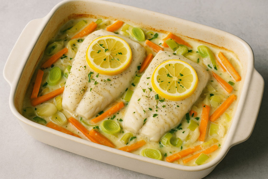 Det fede ved hellefisk i fad med porrer er, at du ikke skal stå og kæmpe i køkkenet. Du skærer, smider i ovnen og lader tiden gøre arbejdet. Resultatet er en ret, der smager dyrere, end den er, og som føles lidt “voksen” at servere – uden at du behøver at være det.