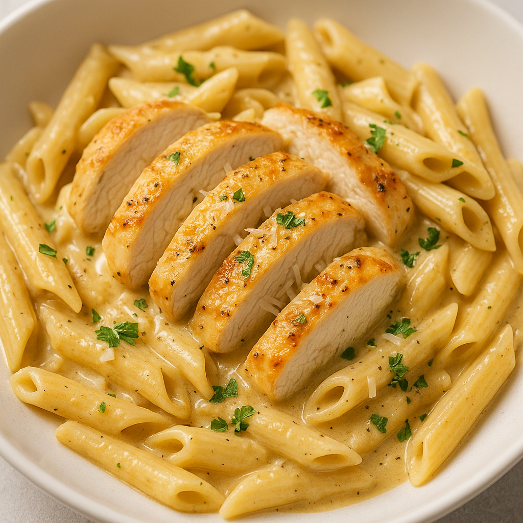 Kylling med pasta er en af de der opskrifter, der føles luksus, men i virkeligheden kan laves på under en halv time. Og det bedste? Den koster mindre end en latte på en café pr. portion.